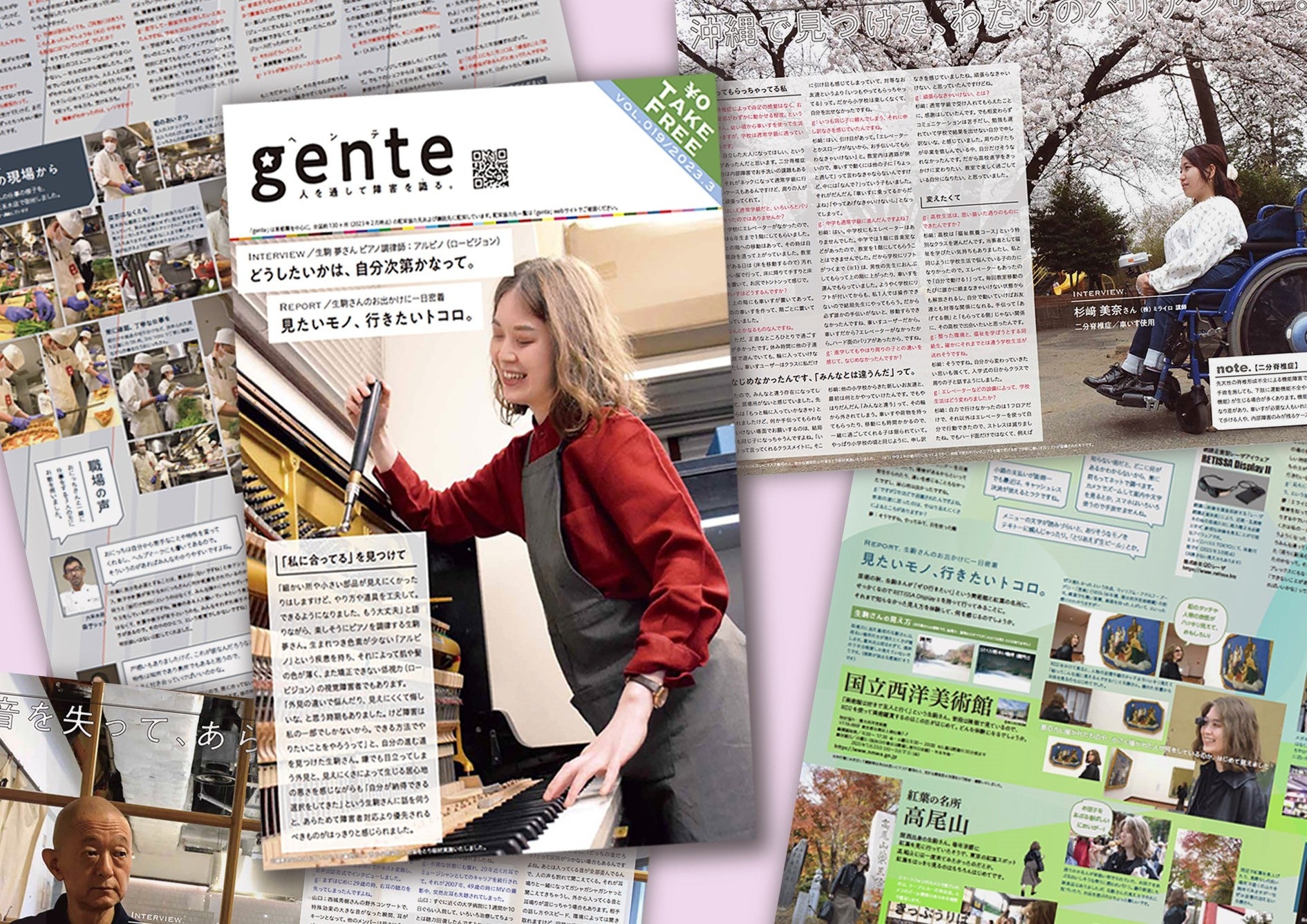変わるきっかけを作るフリーペーパー「gente」です。立って歩けない、目が見えない。これは「障がい」ですか?私達は車いすで行けない場所がある、見えない人が商品を選べない社会に「障害」があると考えています。身体や心の違いによって、社会のどんな障害に直面するのか?障害に直面する人=障害者へのインタビューを通し、その体験や思いの中にある気づきを発信しています。社会に障害があるのなら、皆が当事者のはず。この発信を継続するため、あらゆるアプローチでの資金調達、支援拡大を必要としています。