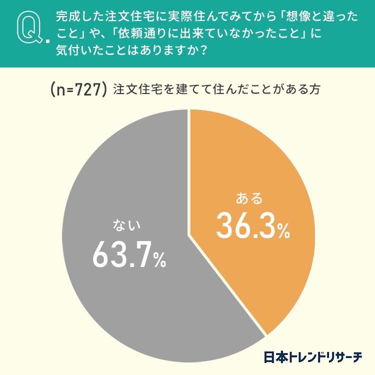36.3%の方が、完成した注文住宅に実際住んでみてから「想像と違ったこと」や、「依頼通りに出来ていなかったこと」に気付いたことが「ある」と答えました。