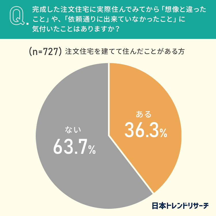 36.3%の方が、完成した注文住宅に実際住んでみてから「想像と違ったこと」や、「依頼通りに出来ていなかったこと」に気付いたことが「ある」と答えました。