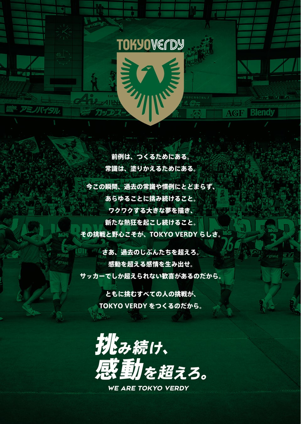 「挑み続け、感動を超えろ。WE ARE TOKYO VERDY」の「挑み続け」には、ヴェルディが創業以来大切にしてきた「パイオニア精神」、「野心・大望」を持ち、行動し続けていくことへの決意を込めました。