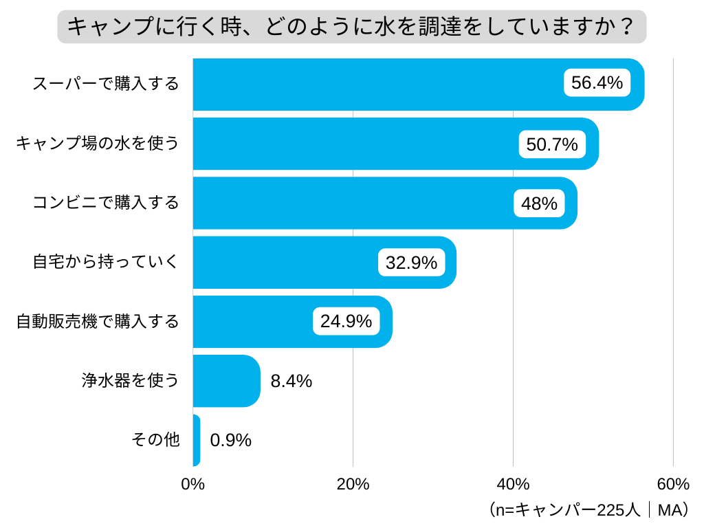また、キャンプ時の水調達の方法については、1位「スーパーで購入」、2位「キャンプ場の水を使う」、3位「コンビニで購入」で、多くの人が購入した水をキャンプで使用しています。