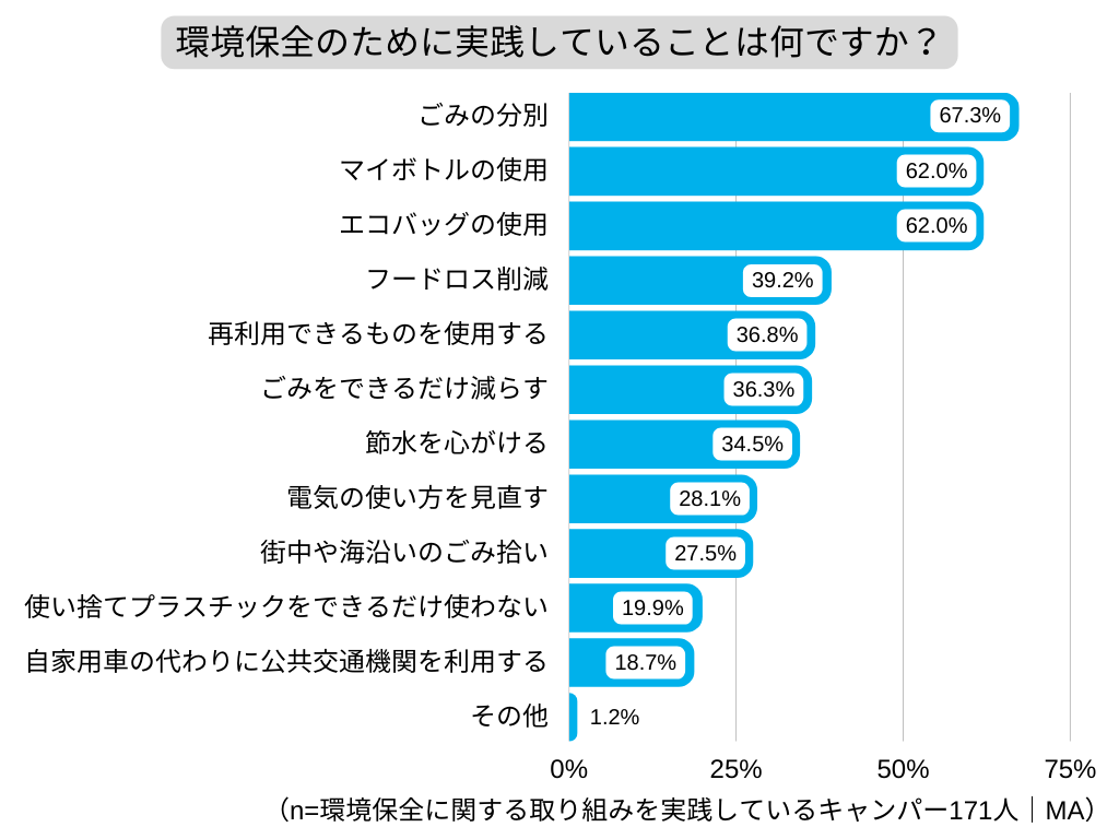 キャンパーが環境保全のために実践している内容は、1位「ごみの分別」、同率2位「マイボトルの使用」、同率2位「エコバッグの使用」でした。