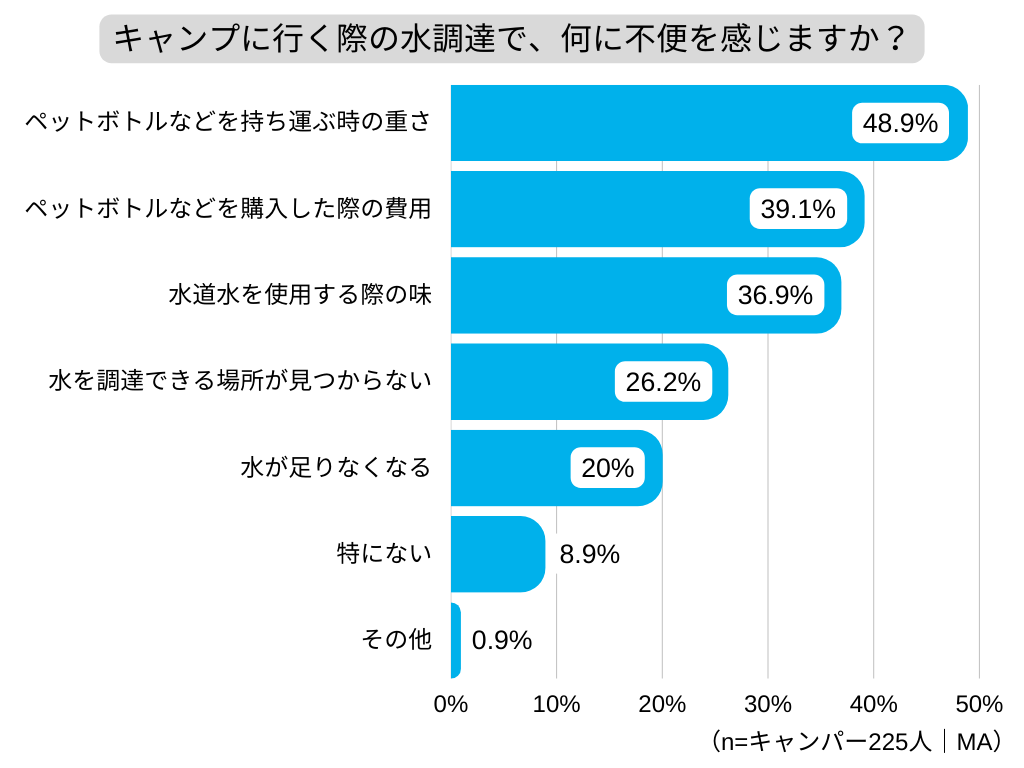 一方で、キャンプの水調達で不便に感じることは、1位「ペットボトルなどを購入した際に持ち運ぶ時の重さ」、2位「ペットボトルなどを購入した際の費用」、3位「水道水を使用する際の味」という結果でした。購入するにせよ、キャンプ場の水道水をそのまま使うにせよ、不便さを感じるポイントがあるようです。