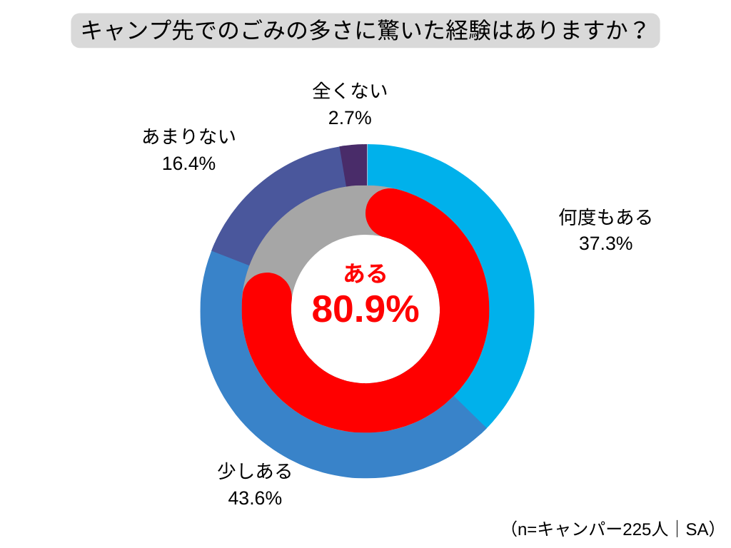 キャンプ先でごみの多さに驚いた経験があるキャンパーは80.9%にのぼり、このあたりもキャンパーの環境意識の高さに繋がっているのかもしれません。