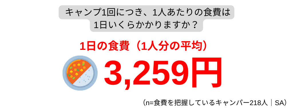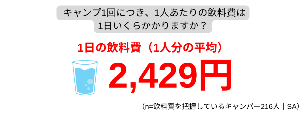 キャンプにかかる食費については、1人平均3,259円/日で、そのうち飲料費が1人平均2,429円/日という結果に。食費の大部分を飲料費が占めていることがわかりました。