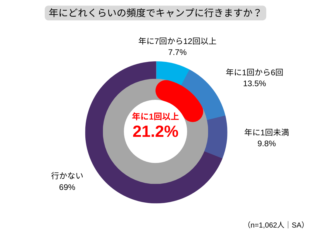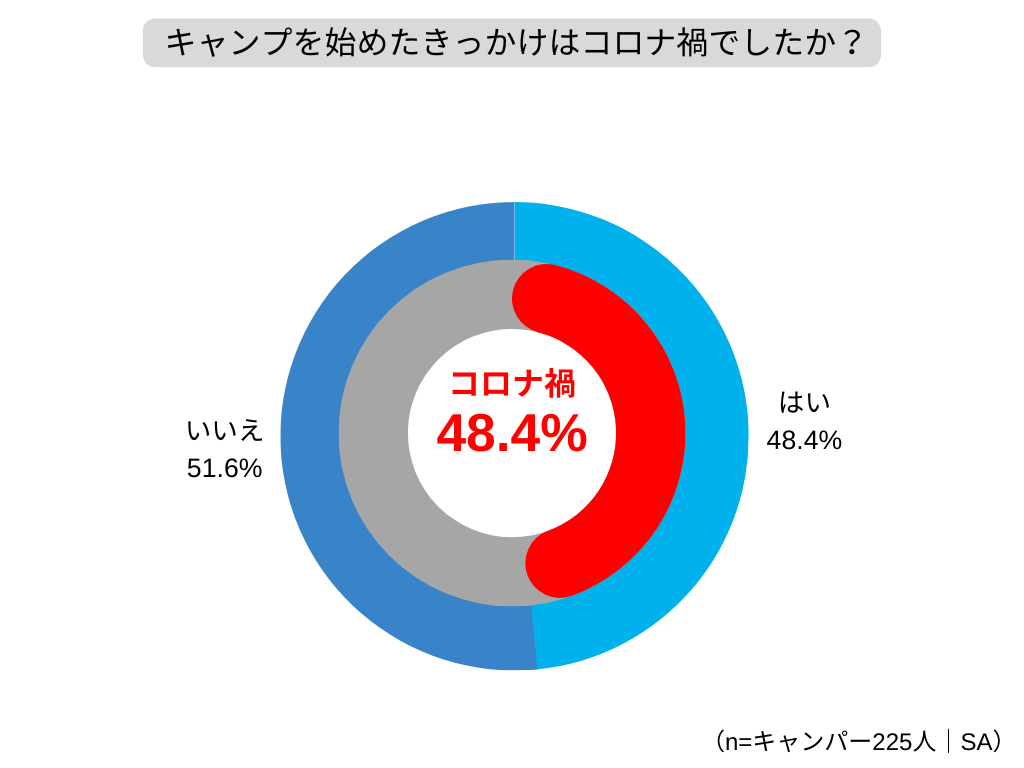 キャンプに行く頻度について聞いてみたところ、キャンパー(ここでは1年に1回以上キャンプに行く人)の割合は全体の21.1%で、そのうち48.4%と約半数が「コロナ禍がきっかけ」でキャンプを始めていました。