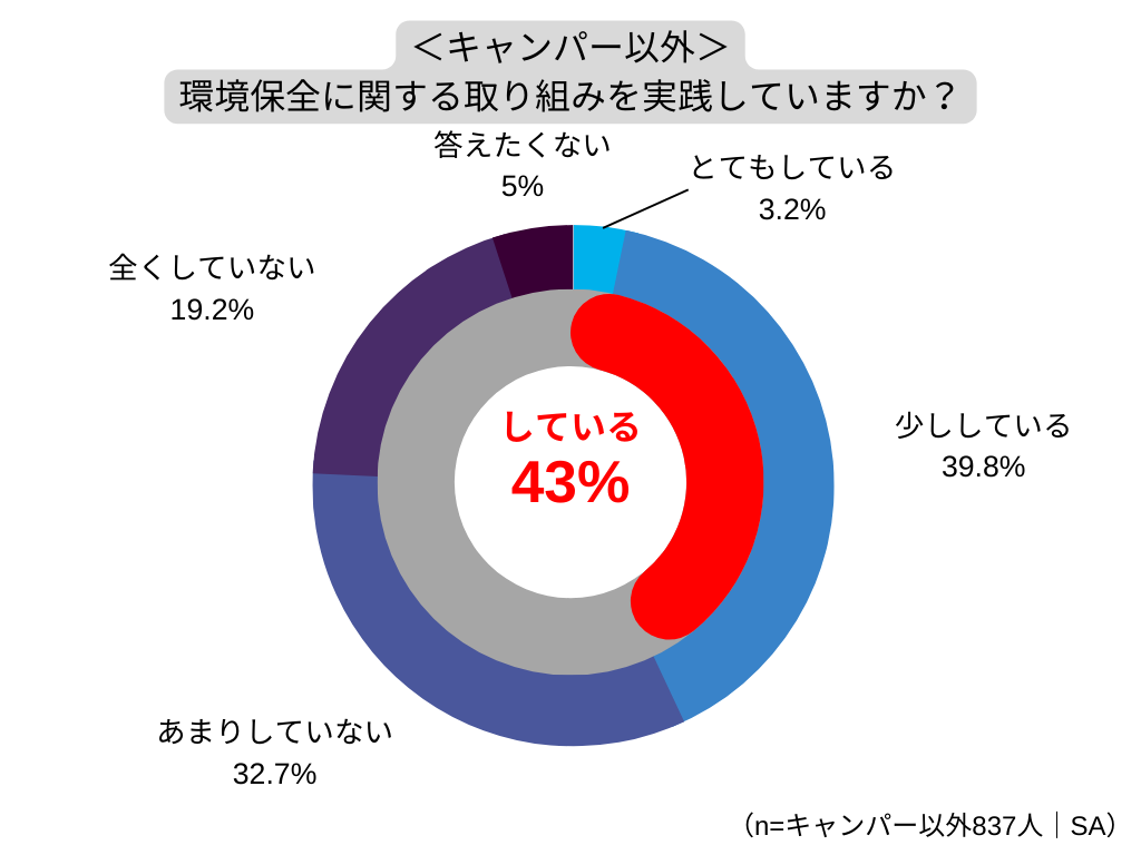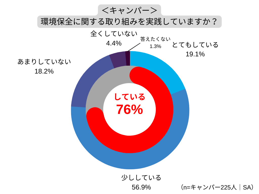 また、環境保全に関する取り組みについて、実践している人の割合は全体で50%、キャンパーでは76%、そうでない人は43%で、キャンパーの実践率はそうでない人の約1.8倍となっています。