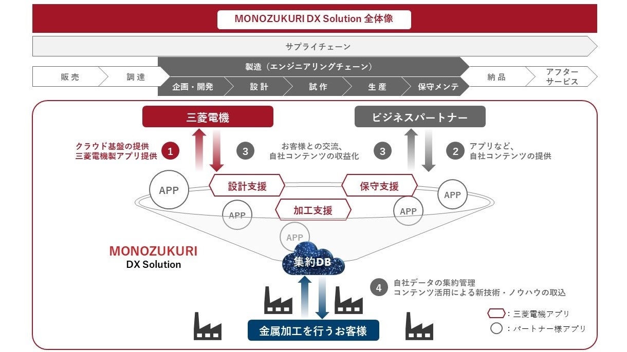 三菱電機が構築する「MONOZUKURI DX Solution」は、オープンで安全なクラウド基盤を通じて、パートナー企業との協業により金属加工業のお客様の生産性向上や自動化・IoTの導入支援などを目指す、ものづくりの全く新しいプラットフォームです。今回はパートナー企業として工作機械・工具・素材・計測器メーカーやシステムインテグレーターなど、現場のエンジニアリングチェーンに携わる企業を募集します。