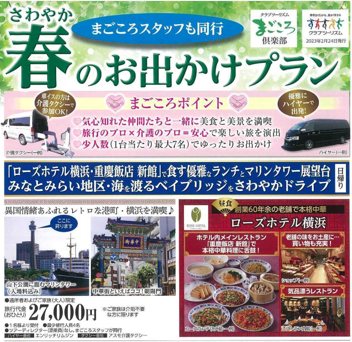 「まごころ倶楽部」では、いきいきとした高齢者文化の創造の実践を目指して、クラブツーリズムが旅行会社として培ったノウハウを活用し、施設利用者を対象として(希望者のみ)、年2回程度の日帰り旅行を2003年の創業時から継続して実施してまいりました。
