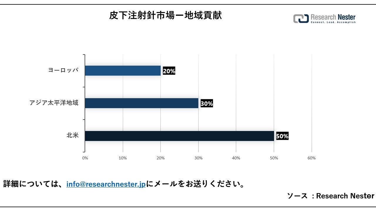 北米の市場のシェアは、他のすべての地域の市場の中でも最大となり、2035年末までに約37%のシェアを占めると予測されています。皮下注射針市場の成長は主に、この地域の高齢者人口の増加に加え、糖尿病や心血管疾患などの慢性疾患の有病率の増加に起因していると考えられます。疾病管理予防センターの最新の調査結果によると、米国では約 37.3百万人が糖尿病を患っており、これは国の総人口の 11.3% に相当します。成人28.5百万人を含む28.7百万人が糖尿病と診断されており、合計96百万人が18歳以上の前糖尿病患者であります。皮下注射針は、インスリンを血流に直接正確に送達できるため、糖尿病の治療に効果的なツールです。これは血糖値を安全かつ効率的に調節するのに役立ちます。