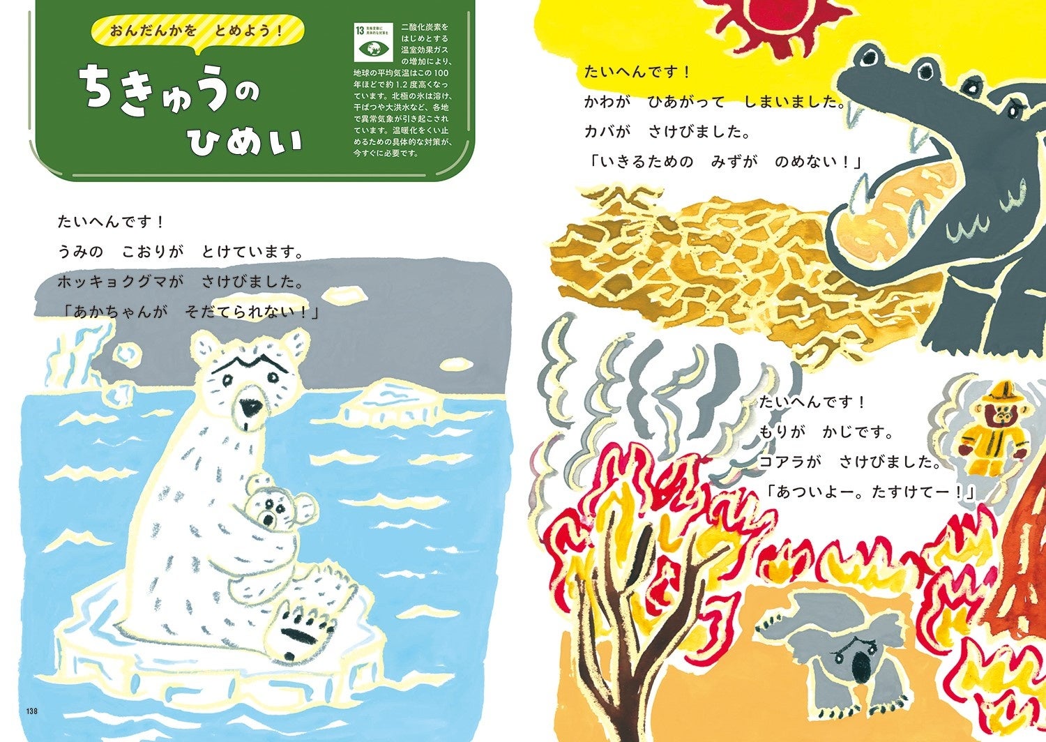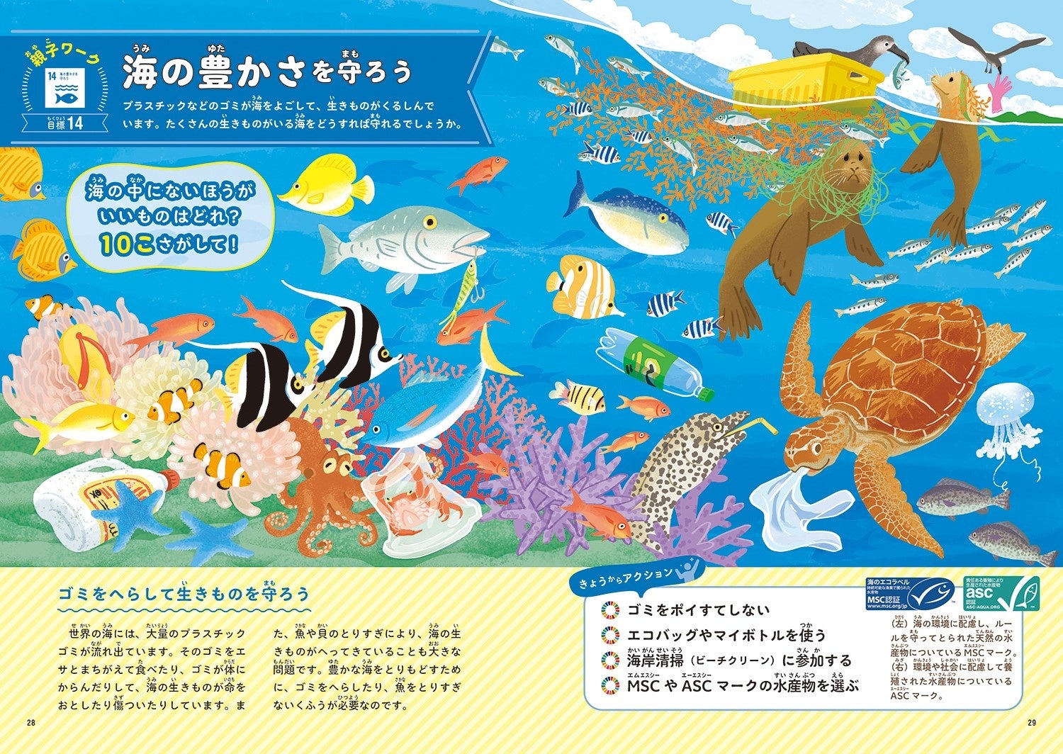 すぐにはじめられる行動として「きょうからアクション」を提案。エコバッグを使う、海岸清掃に参加する……など、ひとりひとりができることを実行することで、SDGsの目標は達成へと近づきます。また、世界に貢献している実感をもつことは、こどもの視野をより広げます。対象年齢は、よみきかせるなら3才から、じぶんで読むなら6才から。