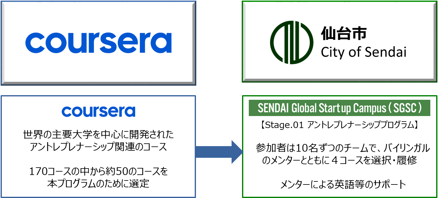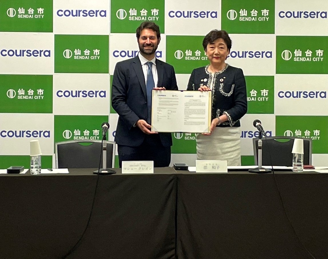 2023年5月15日、仙台市は、世界最大のオンライン学習プラットフォームのCoursera, Inc.と、アントレプレナーシップの向上に関するMOU(Memorandum Of Understanding:日本語訳 了解覚書)を締結しました。このMOU締結により、仙台・東北の若者が世界最先端のアントレプレナーシップ教育プログラムを受講できる環境を構築し、仙台・東北からグローバル人材の育成・グローバルで活躍するスタートアップの輩出を目指します。