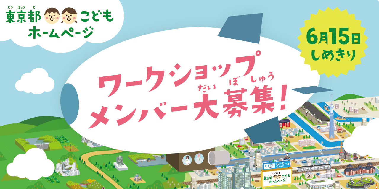 東京都こどもホームページは、子供たちが楽しみながら東京の魅力や都政への関心を高めてもらうため、制作過程に子供たちが参加し、子供たちと一緒に作ったホームページです。コンテンツや内容をより充実させるため、ワークショップに参加するメンバーを募集します。