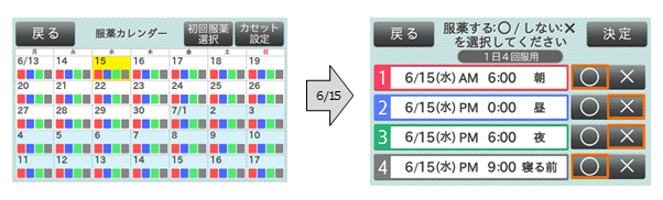 服薬時間ごとでのスケジュール設定を実現し、外出など利用者の個別予定にも対応できます。