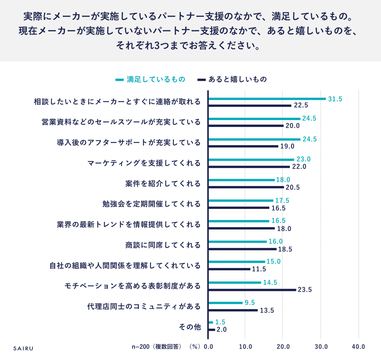 代理店がメーカーから受けている支援で満足度が高いのは、「相談したいときにすぐに連絡が取れる」「セールスツールが充実している」「導入後のアフターサポ―トが充実している」が上位でした。