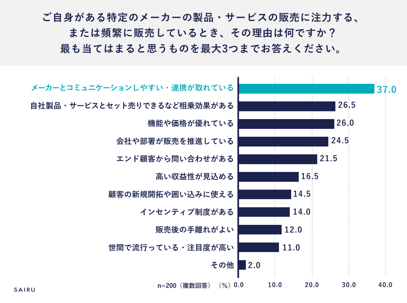 「特定メーカーの製品・サービスに注力する理由」を聞いたところ、メーカーとコミュニケーションしやすい・連携が取れているが37%で最多。次いで、自社製品・サービスとセット売りできるなど相乗効果があること、機能や価格が優れていることが挙がりました。