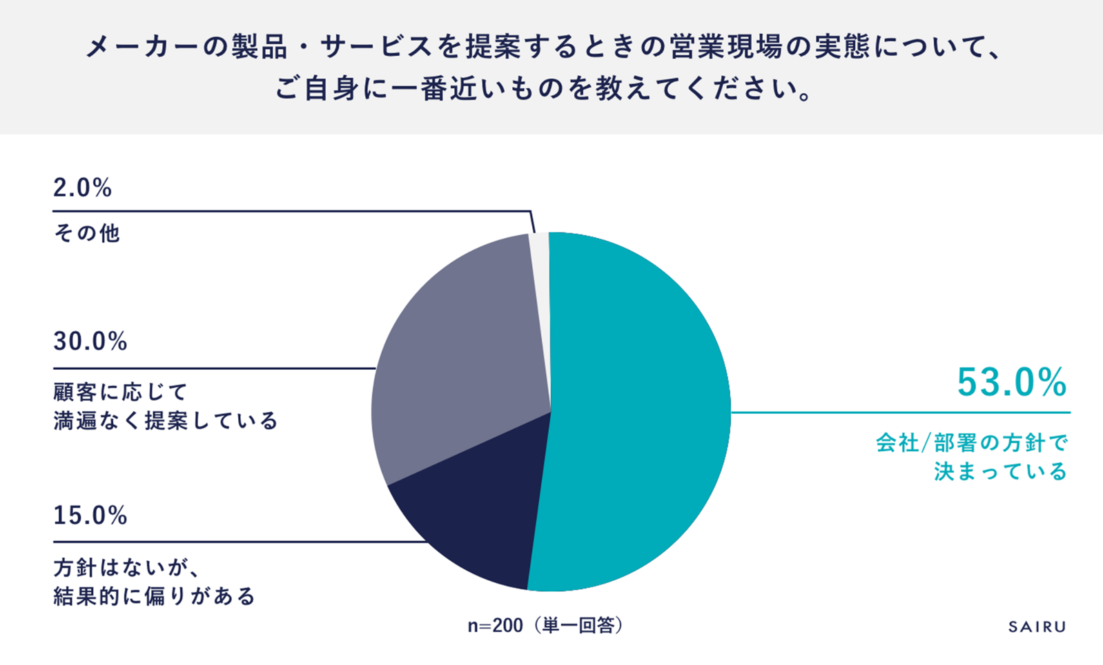 販売する製品・サービスは会社の方針で決まっていると回答した方が53%で最多。次いで顧客に応じた提案をしている方が30%となりました。