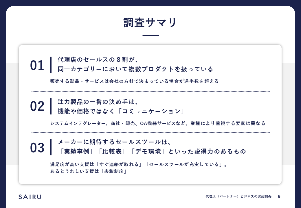 また、代理店の製品・サービスと、自社の製品・サービスをセットで提案できるストーリーがあると、営業担当者にとっては注力しやすいこともわかりました。