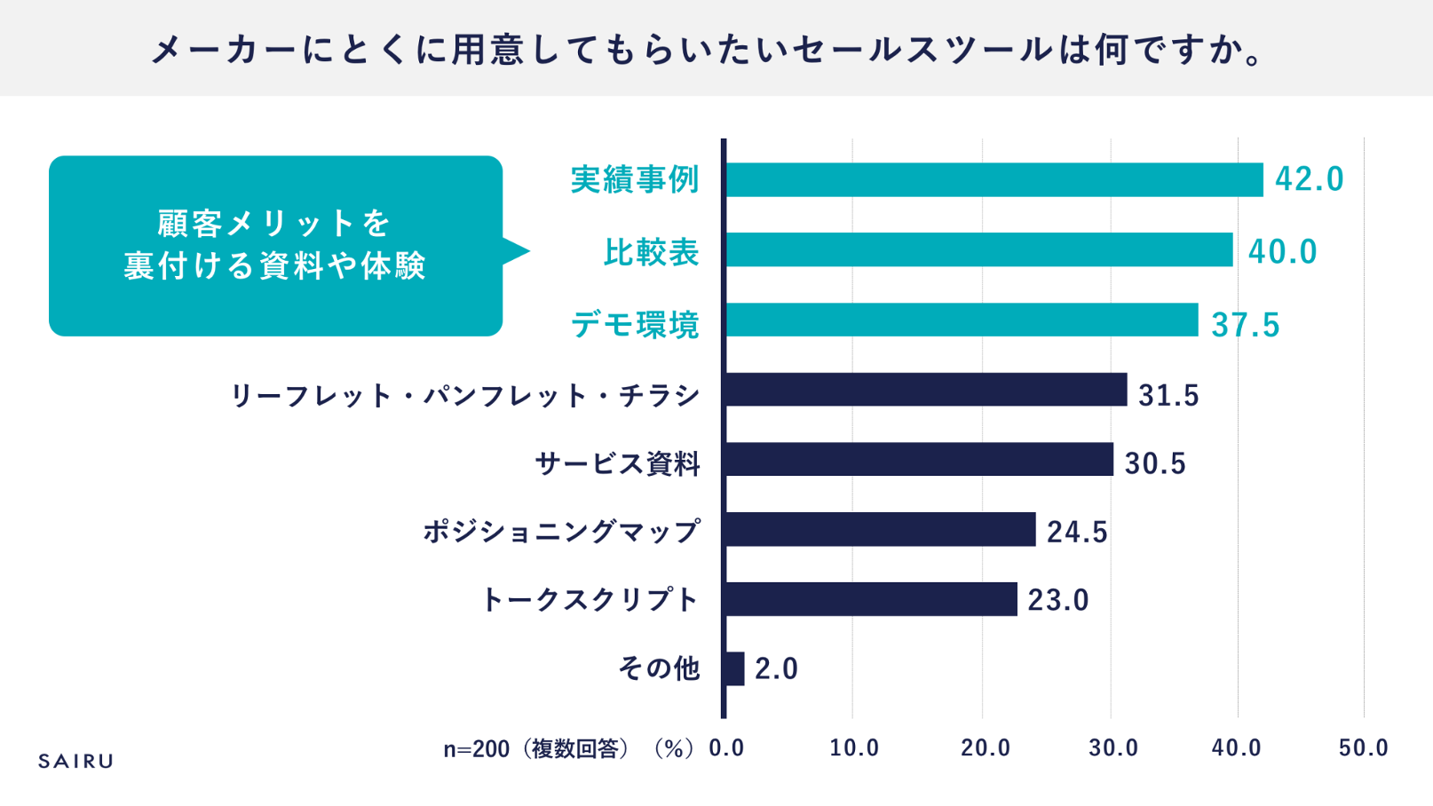 また、メーカーに用意してもらいたいセールスツールは実績事例、比較表、デモ環境が上位でした。