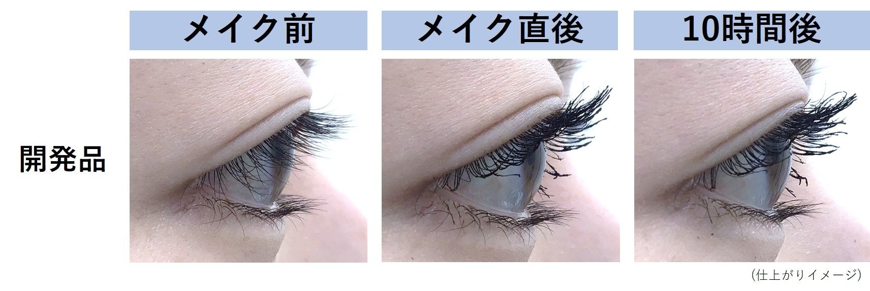 化粧もち効果の検証には、通常使うようにビューラーとマスカラを使用し、メイク直後と10時間後のまつ毛のカールの度合いやにじみの有無を外観評価しました。その結果、10時間後もまつ毛はメイク直後のカール度合いを持続しており、代表的な化粧くずれであるにじみもないことが確認できました(図6)。