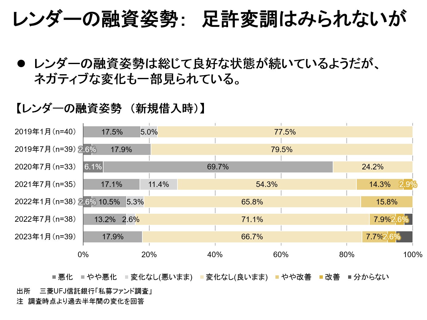 足許のレンダーの融資姿勢は総じて良好な状態が続いている。ただし、ネガティブな変化も一部見られている。