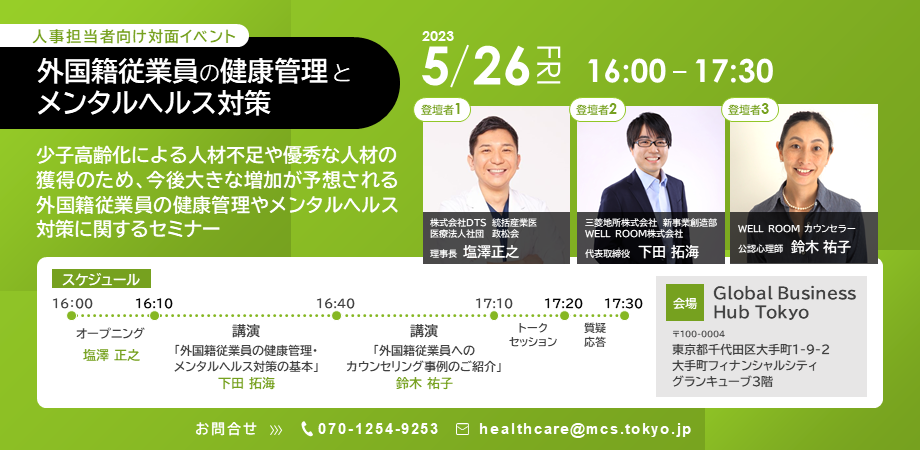 この状況を踏まえ当社は、コンサルティングから設計、開発、ハードウェア・ソフトウェアの選定・導入、運用、保守にいたるまでシステムに関するすべてをサポートする総合情報サービス会社である株式会社DTS、在宅医療・外来診療を中心とした良質で幅広い医療を提供する医療法人社団政松会と共に、「外国籍従業員の健康管理とメンタルヘルス対策」について、医師やカウンセラー等の専門家をお招きし、対面イベントを開催することとしました。今回の対面イベントを第一弾とし、今後は3社共同で定期的にイベントやセミナーを開催する予定です。