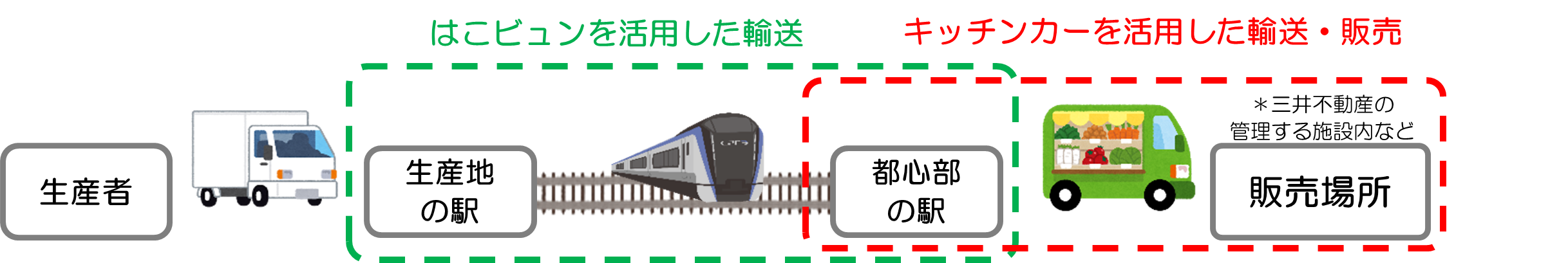 駅から駅までの輸送に強みをもつ「はこビュン」と、「モビックスパーク」のキッチンカーが連携することで、産地から販売場所まで一貫したコーディネートを行い、生産者と都心のお客さまをつなぎます。