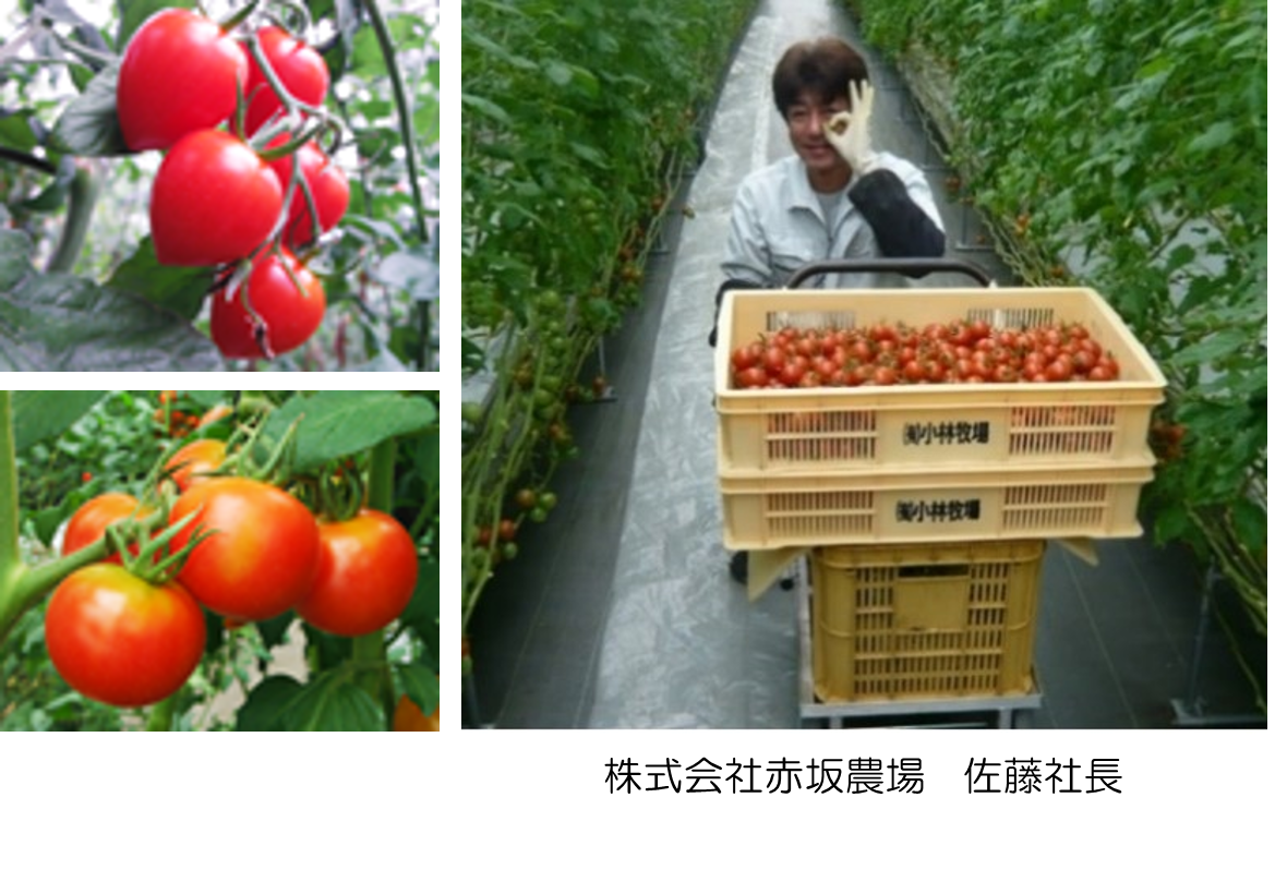 「赤坂とまと」は山梨県甲斐市のブランドトマトです。「美味しいトマトを食べてほしい」という生産者の想いで完熟してからの収穫を行っており、トマトの甘さが特長です。完熟してから収穫するため、輸送が難しく普段は山梨県外にあまり出回りません。