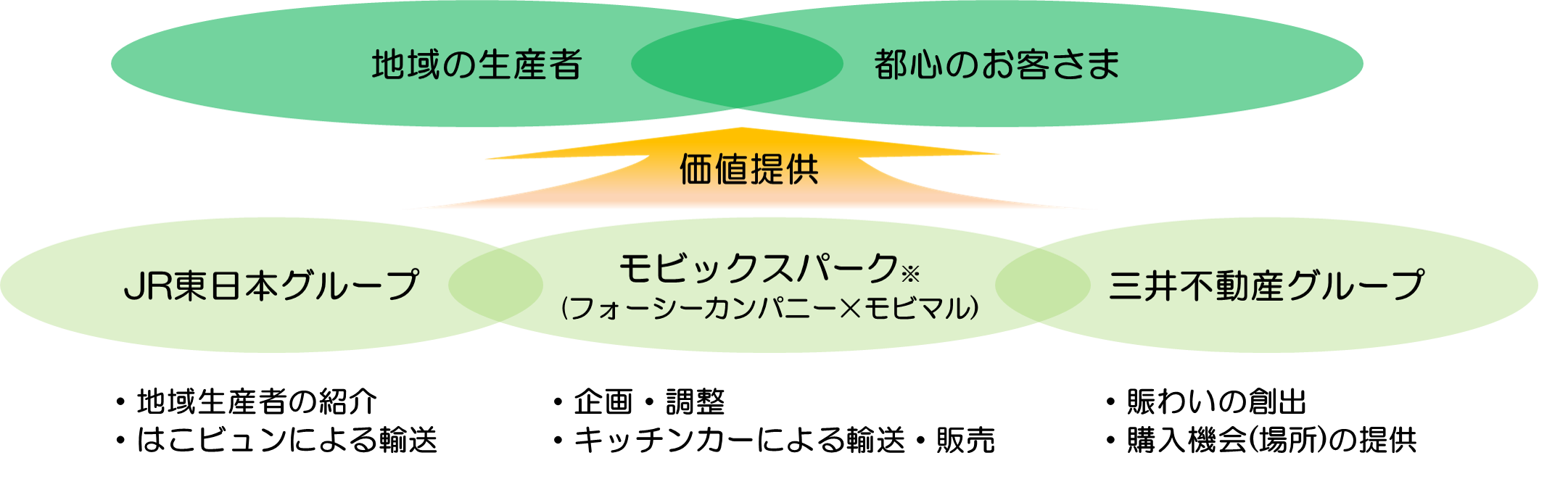 各社のアセットを活用し地域の高鮮度産直品を都心にお届けすることで、地域の魅力発信による地域創生とともに、都心のお客さまへは新たなショッピング体験という価値を提供します。