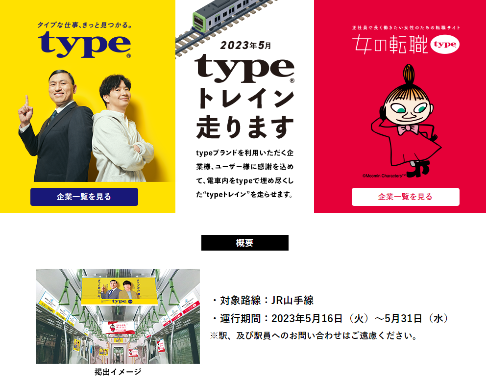 typeブランドを利用いただく企業、ユーザーの皆様に日々の感謝を込めて、電車内をtypeで埋め尽くした“typeトレイン”を走らせます。