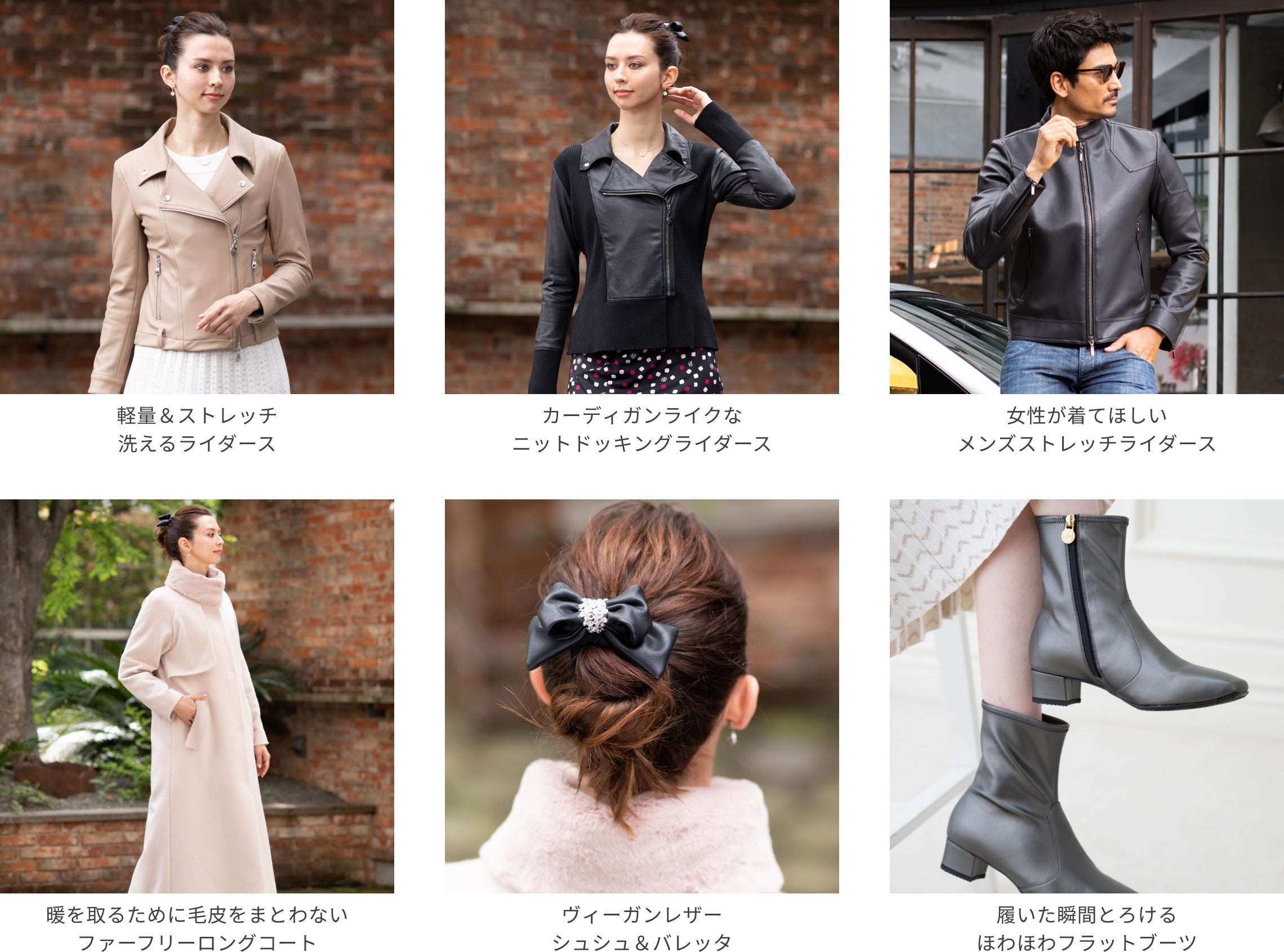 今回、リリースした「メンズライダース」の他に、レディースでも「ヴィーガン素材」を使用したストレッチライダースやコート、ブーツ、ヘアアクセサリーなどの「エシカル&エレガント」コレクションを発売しています。