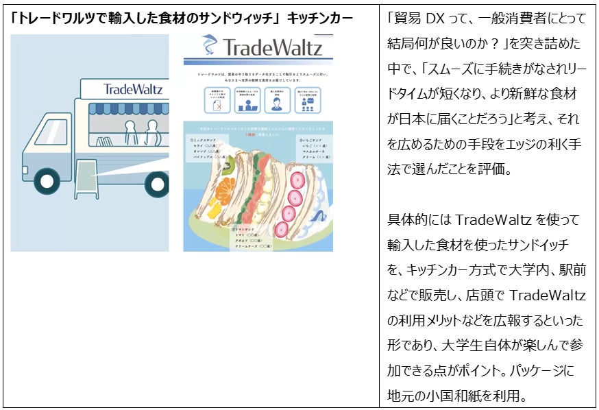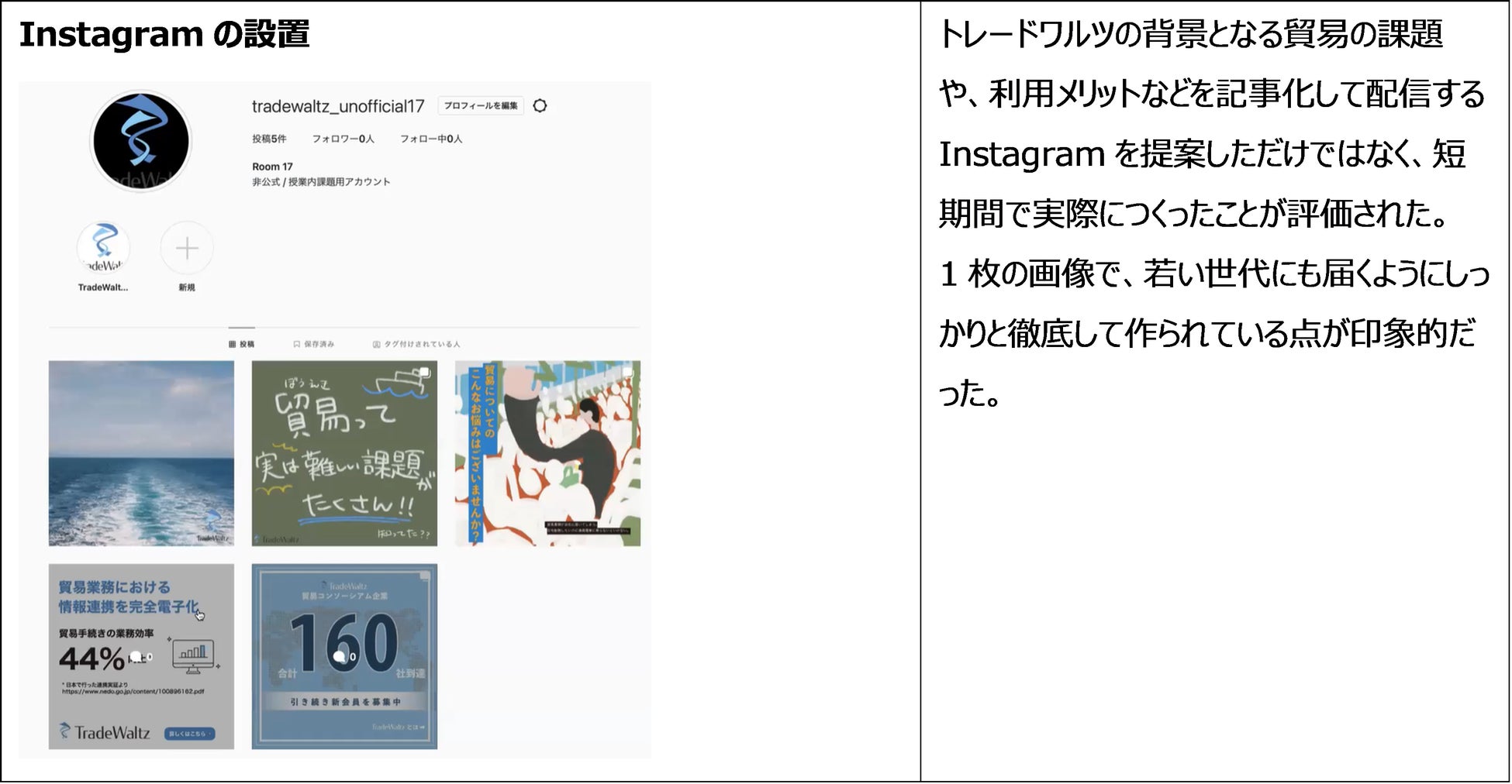 「貿易のDXという難しいテーマではありましたが、トレードワルツさまからの分かり易い講義、解説があったため、学生達は思った以上に理解し、企画できたようです。また難易度の高いテーマに対して個人ではなくチームで知恵を絞って1つの案にまとめ上げる大変は、非常に貴重であり有意義でした。実際に3回の中で学生達の成長を見ることができました。」