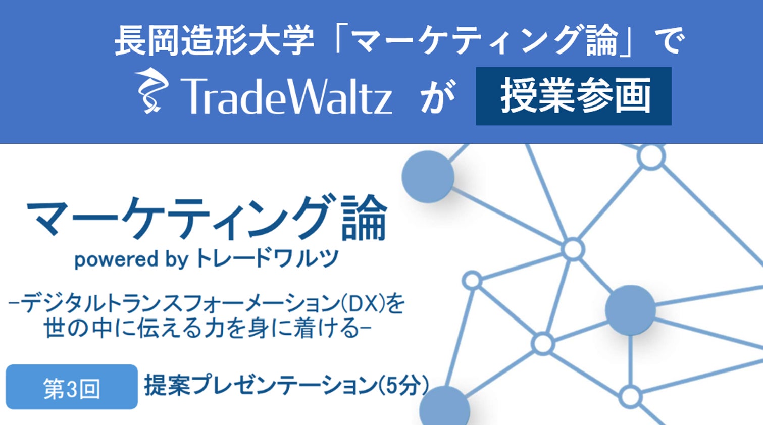 トレードワルツは、ミッションとして掲げている「貿易の未来をつくる」を実現するために10年単位の長期スパンでの取組が必要であると考え、DXのデザインコンペや授業の実施を通して10年後や20年後の事業を担う大学生世代との関わりを持っています。そうした取組の一環として2022年度後半、長岡造形大学 水川教授が開講する「マーケティング論」の中でDXをテーマに下記内容で、計3回授業に参画させて頂きました。