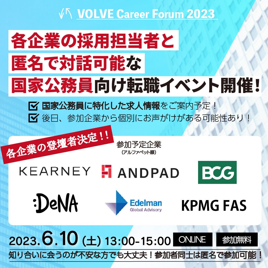 本イベントには中央省庁での経験を活かせる求人を有する複数の企業様にご登壇頂くことを予定しており、特設サイト(https://lp.volve.co.jp/forum/top#sankakigyo)にて順次参加企業様を発表しております。