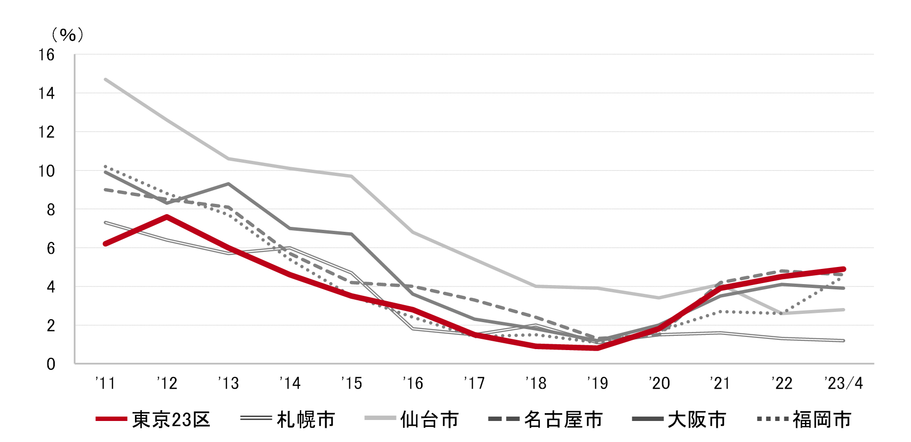 空室率は前月比マイナス0.07ポイントの5.19%となり、4ヵ月ぶりで小幅に低下した。主要エリア内での拡張移転や建替えに伴う移転等により成約した。潜在空室率は前月比マイナス0.03ポイントの6.99%だった。オフィス需要は活発な状況が継続している。移転に際して立地だけでなく設備水準を重視するテナントが多く、建築中ビルや築浅ビルへのテナントの引き合いが増加している。