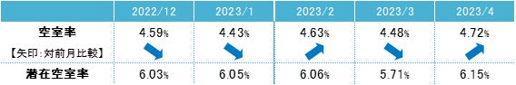 空室率は前月比プラス0.24ポイントの4.72%となり、4%台の低水準が6ヵ月連続している。空室を抱えた新築ビルの竣工や、主要エリアで部分解約により空室が生じたことが主な上昇要因となっている。新築ビルは商談中の募集区画もあり、今後は成約が進むとみられる。潜在空室率は前月比プラス0.44ポイントの6.15%だった。幅広い業種において、拡張や立地改善等の前向きなテナントの移転が多くなっている。