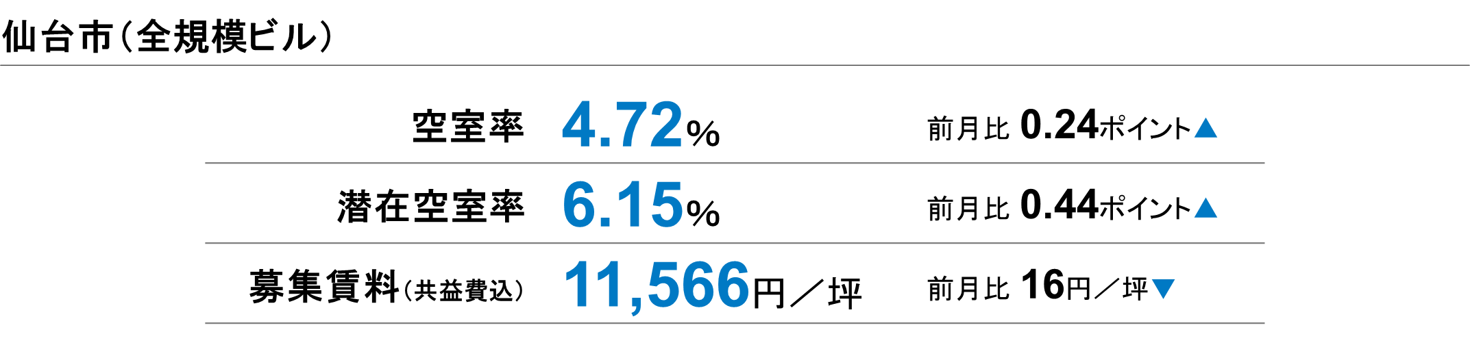 募集賃料は前月比マイナス16円/坪の11,566円/坪となった。4ヵ月連続で下落したが、小幅な動きに止まって おり、オーナー側が募集条件を見直す動きは広がっていない。