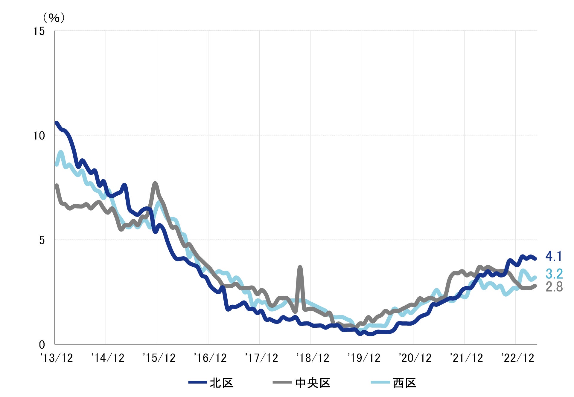 大規模ビル 主要3区 空室率:「北区」4%前後で推移