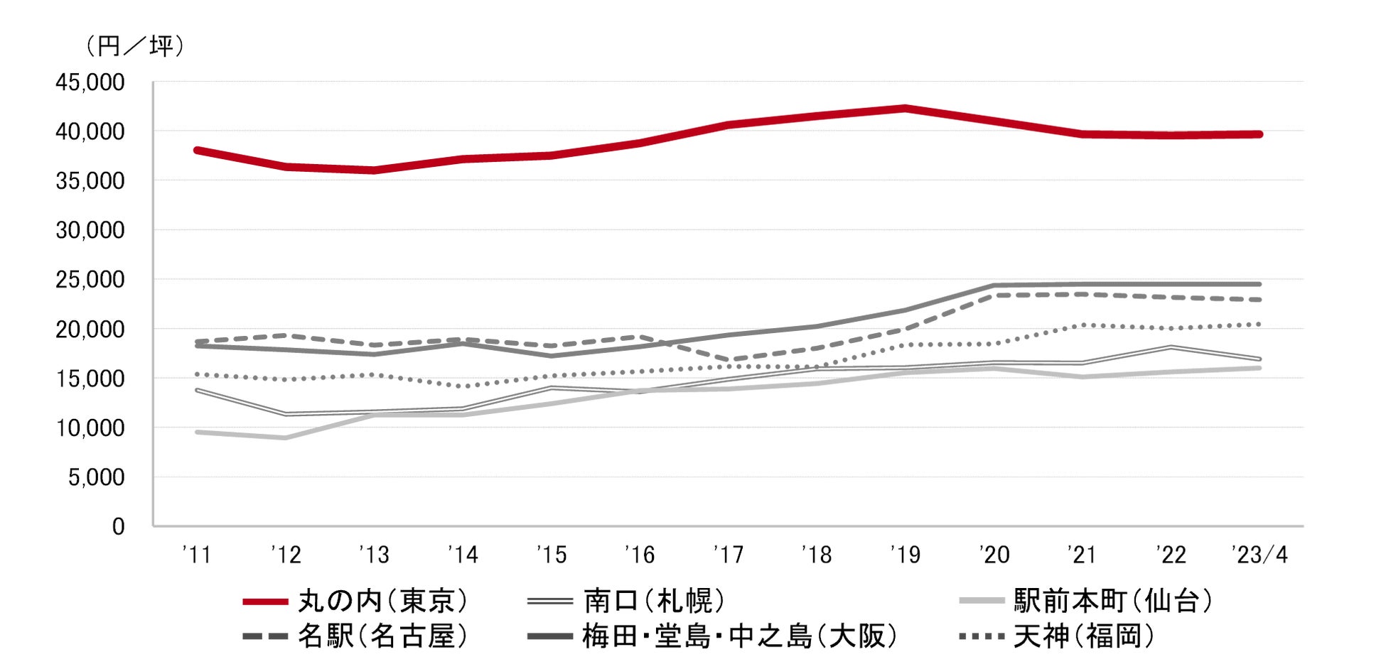 <募集賃料の推移(6大都市 大規模ビル・主要駅前地区)>