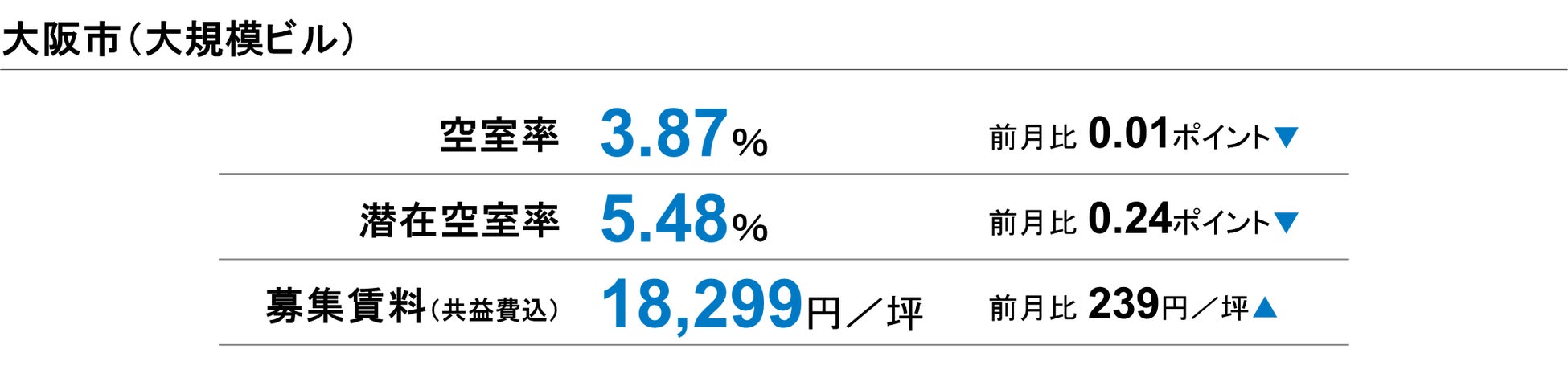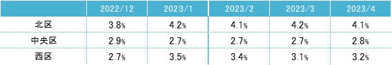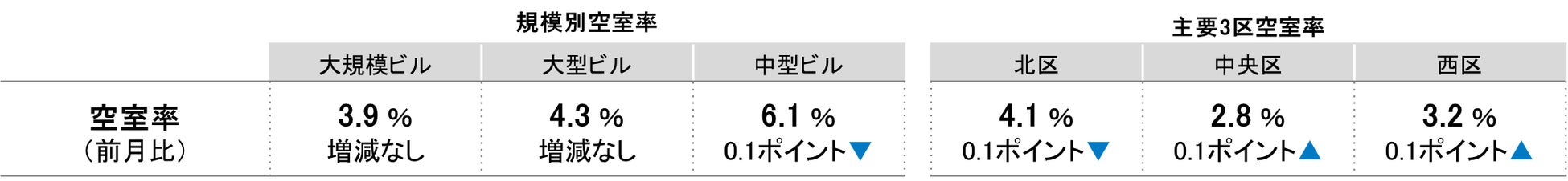 空室率は前月比マイナス0.01ポイントの3.87%と、前月からほぼ横ばいで、昨年後半から緩やかな低下傾向が 続いている。新築ビルへ移転したテナントの二次空室や集約移転により空室が生じたものの、拡張移転や館内 増床等で成約し、前月からはわずかな動きとなった。潜在空室率は前月比マイナス0.24ポイントの5.48%だった。オフィス需要は比較的小口の面積帯が中心だが、拡張移転や館内増床等の前向きな動きが多い。