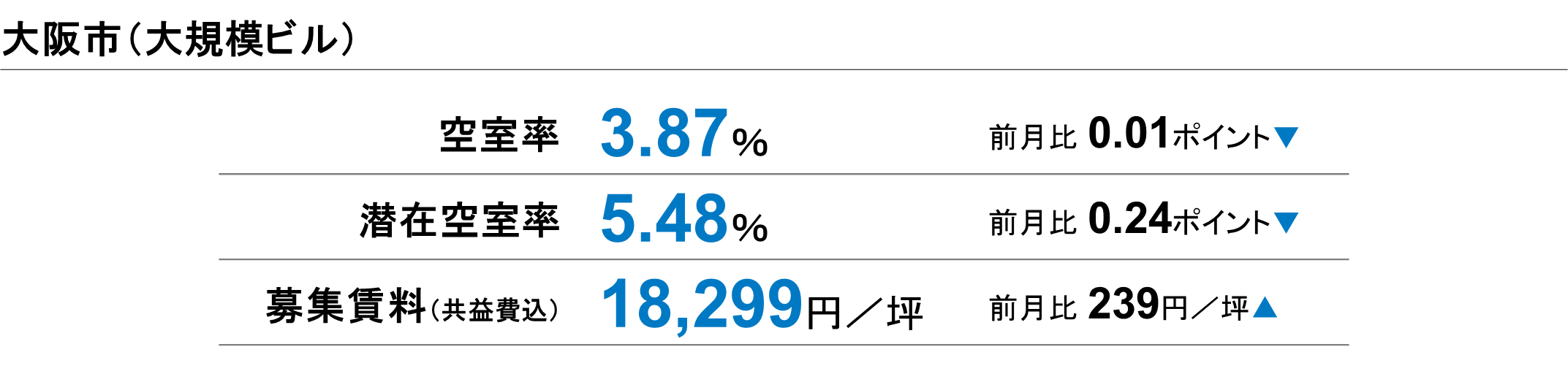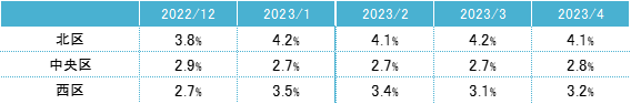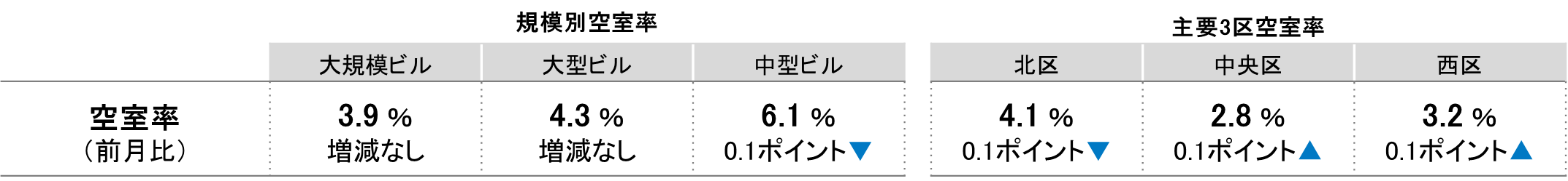 空室率は前月比マイナス0.01ポイントの3.87%と、前月からほぼ横ばいで、昨年後半から緩やかな低下傾向が 続いている。新築ビルへ移転したテナントの二次空室や集約移転により空室が生じたものの、拡張移転や館内 増床等で成約し、前月からはわずかな動きとなった。潜在空室率は前月比マイナス0.24ポイントの5.48%だった。オフィス需要は比較的小口の面積帯が中心だが、拡張移転や館内増床等の前向きな動きが多い。