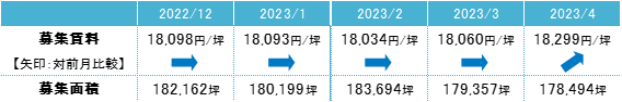 募集賃料は前月比プラス239円/坪の18,299円/坪となった。2ヵ月連続の上昇だが、募集条件を見直す動きは 限定的な水準に止まっている。