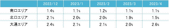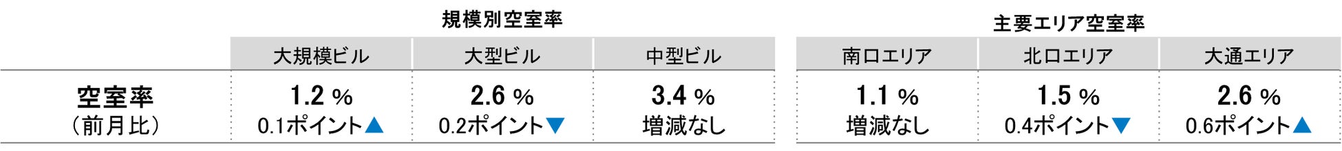 空室率は前月比マイナス0.02ポイントの2.28%となり、統計開始以来の最低値を更新した。集約移転や部分解約により現空床が発生した一方、拡張移転や建替えに伴う移転等で成約した。エリア別では「大通」が前月比プラス0.6ポイントの大幅な上昇となった。潜在空室率は前月比プラス0.01ポイントの3.48%だった。オフィス需要は活発な状況が継続し、建築中ビルにおいてもテナント誘致が順調に進んでいる。