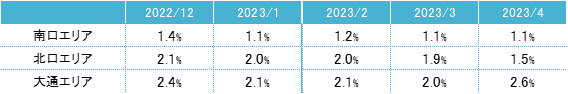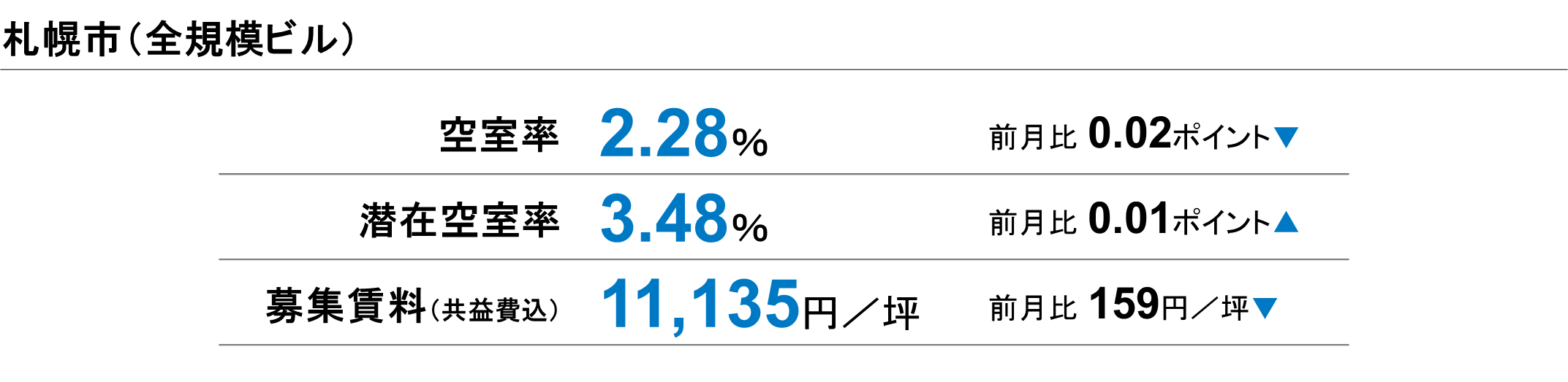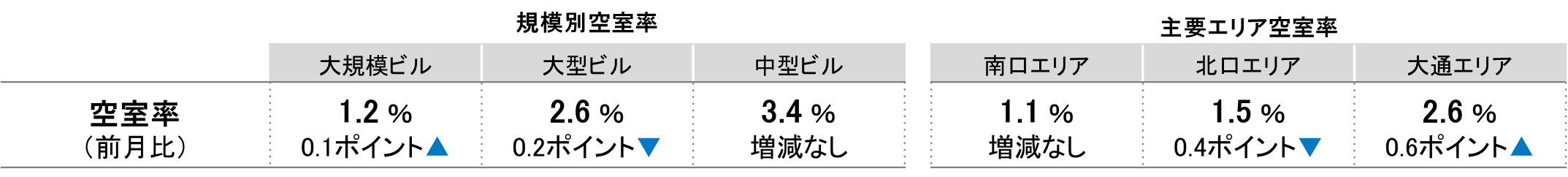空室率は前月比マイナス0.02ポイントの2.28%となり、統計開始以来の最低値を更新した。集約移転や部分解約により現空床が発生した一方、拡張移転や建替えに伴う移転等で成約した。エリア別では「大通」が前月比プラス0.6ポイントの大幅な上昇となった。潜在空室率は前月比プラス0.01ポイントの3.48%だった。オフィス需要は活発な状況が継続し、建築中ビルにおいてもテナント誘致が順調に進んでいる。
