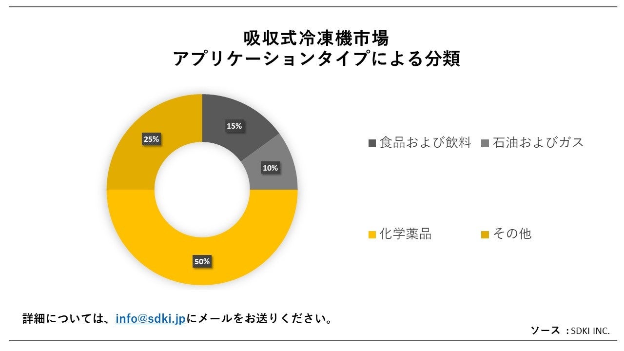 エネルギー源の種類に基づいて、ガス加熱式のセグメンテーションは、世界の吸収式冷凍機市場を最大のシェアでリードしています。推計では、予測期間中にこのセグメンテーションの優位性の一貫性が示唆されています。ガス加熱式吸収式冷凍機は、天然ガスまたはプロパンを使用して水と臭化リチウムの溶液を加熱し、他のエネルギー源タイプベースの吸収式冷凍機よりも高い性能係数を提供します。化石燃料を使用しているにもかかわらず、と米国エネルギー省が実施した調査によると、比較的熱燃焼式の吸収冷凍機は、電気式または圧縮ベースの冷凍機に比べて温室効果ガス排出量が 50―60% 少ないと推測されています。