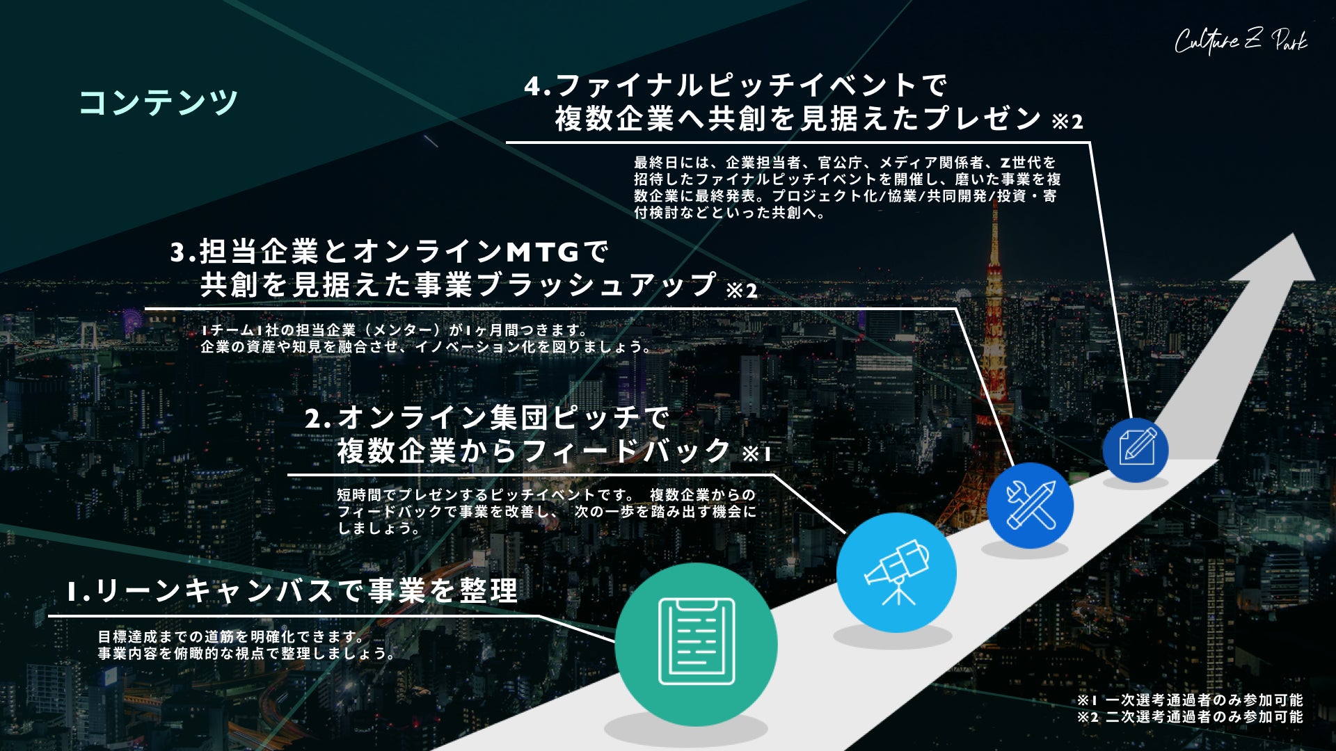 Culture Z Innovationでは、Z世代イノベーターの事業アイディアに対して、約2ヶ月の4段階のコンテンツを通じて、持続可能な事業アイディアのイノベーション化を目指します。