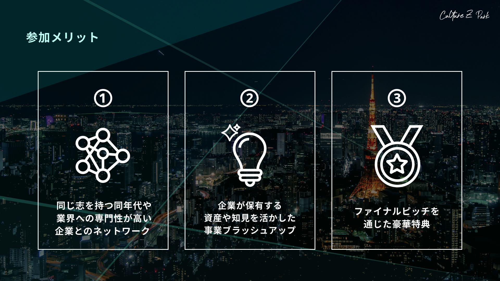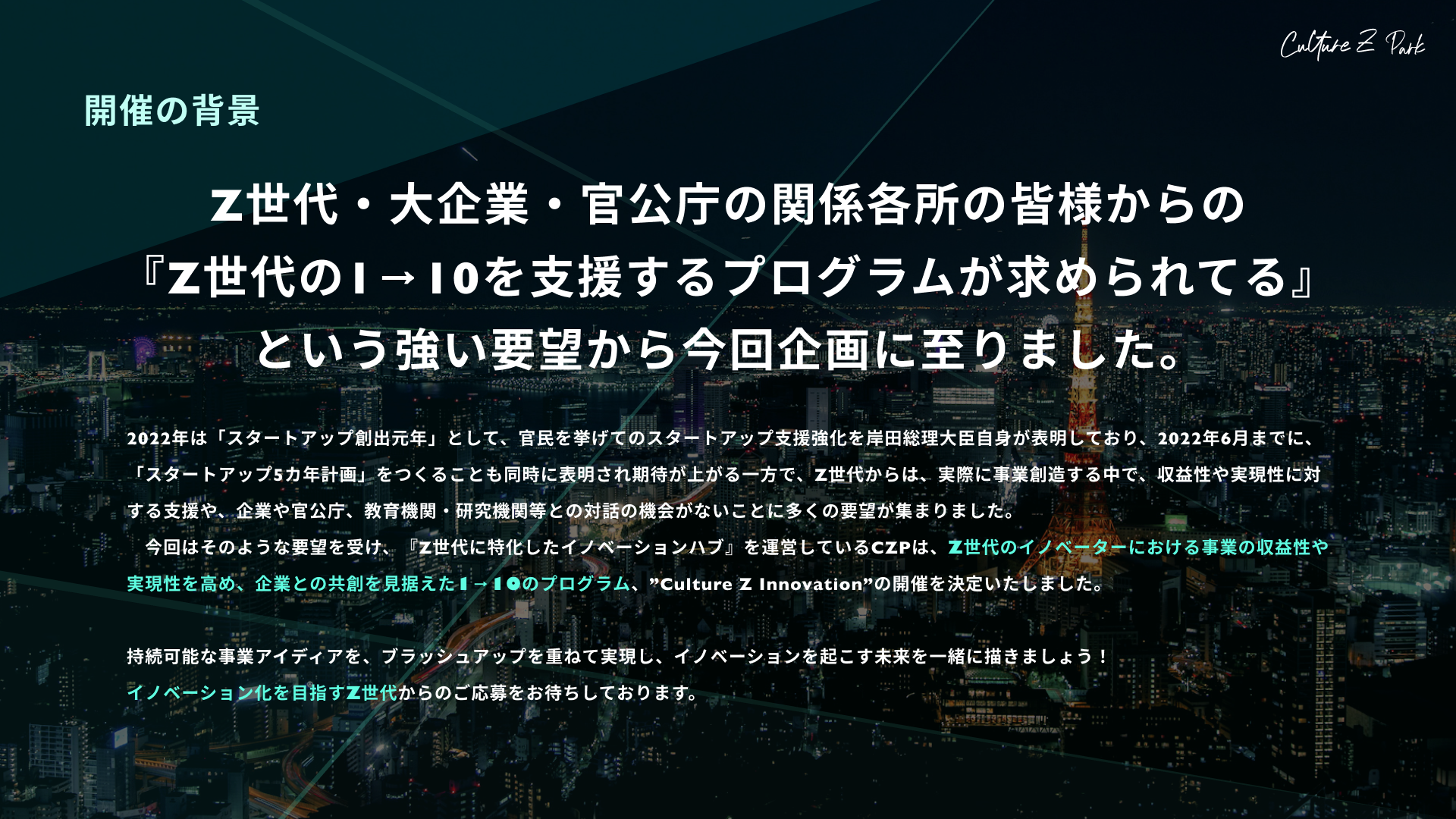 これにより、スタートアップ・エコシステムの形成に期待が上がる一方で、Z世代のイノベーターからは、実際に事業創造する中で、収益性や実現性に対する支援がないことや、中堅・大企業や官公庁、大学などの教育機関・研究機関等との対話の機会がないことに多くの要望が集まりました。今回はそのような要望を受け、『Z世代に特化したイノベーションハブ』を運営しているCZPは、Z世代のイノベーターにおける事業の収益性や実現性を高め、企業との共創を見据えた1→10のプログラム、”Culture Z Innovation”の開催を決定いたしました