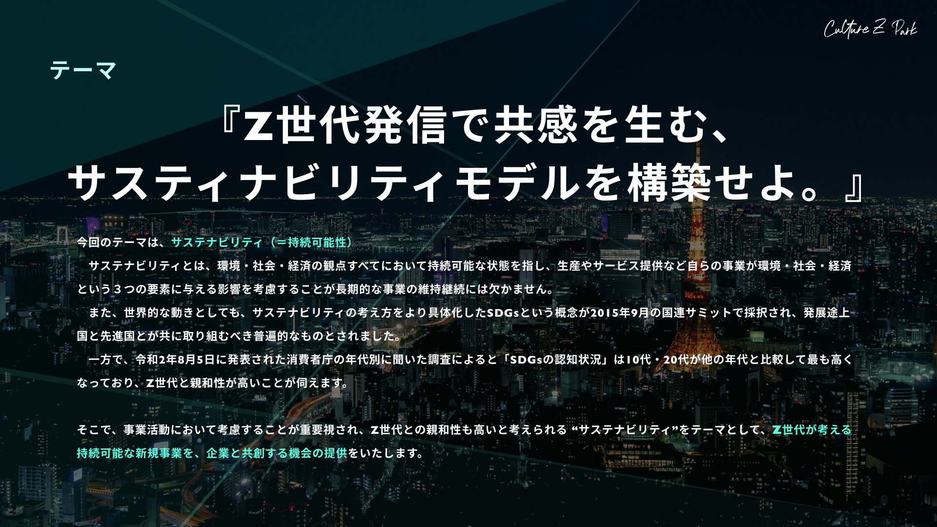 そこで、事業活動において考慮することが重要視され、Z世代との親和性も高いと考えられるサステナビリティをテーマとして、Z世代が考える持続可能な新規事業を、企業と共創する機会の提供をいたします。