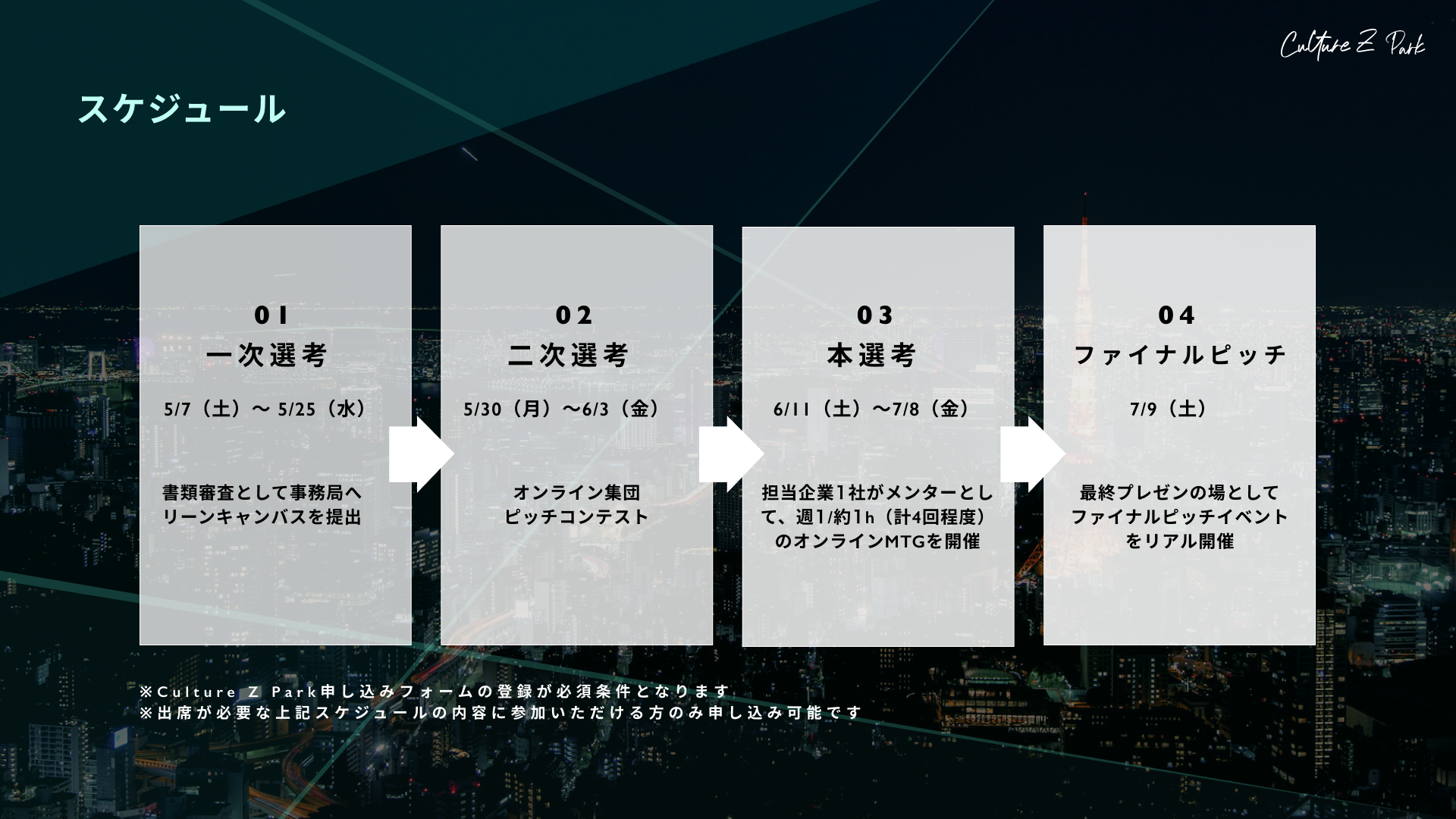 上記期間内のいずれかの日程で、1~2時間程度のオンライン集団ピッチコンテストを開催予定。