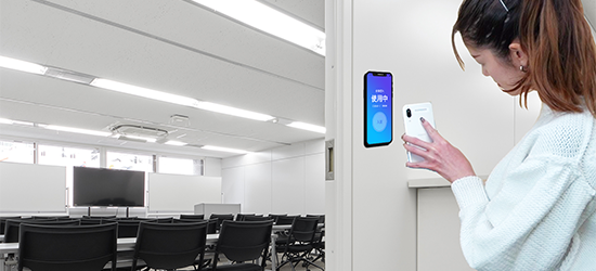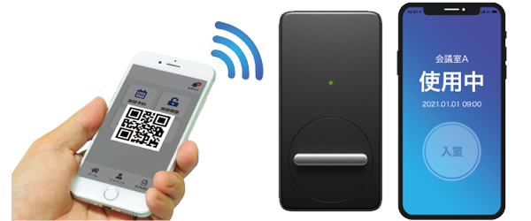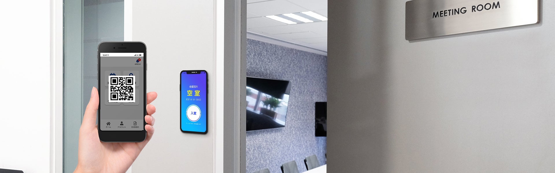 オフィスの会議室やWEB会議用個室ブースをスマートフォンから予約、スマートロックで解錠できるシステム。受付や鍵の受け渡しがいらなくなり、予約管理の無人化・省人化を実現します。